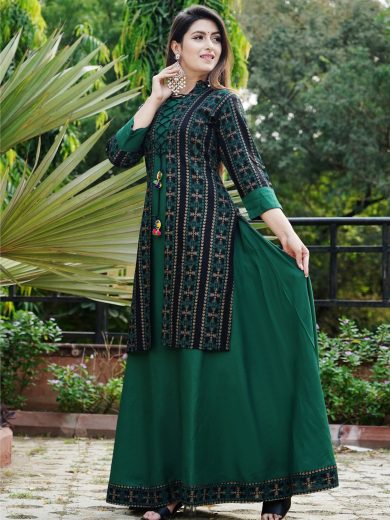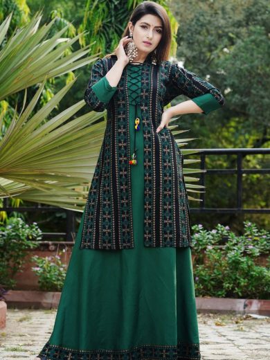 Women Printed Cotton Rayon Anarkali Kurta (Green, Black)
